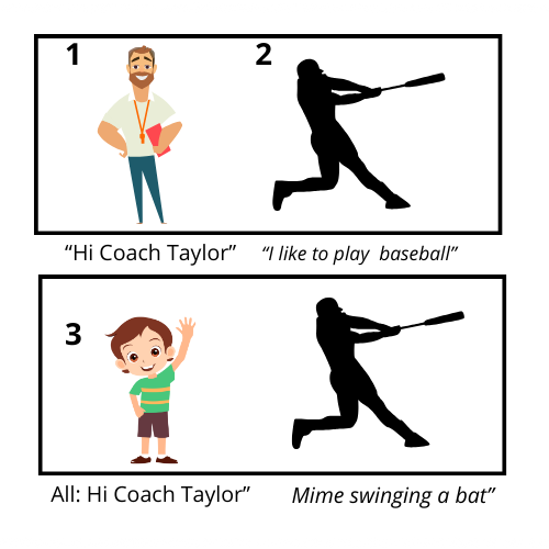 The facilitator says: “My name is Coach Taylor and I like to play baseball” (swings a bat).